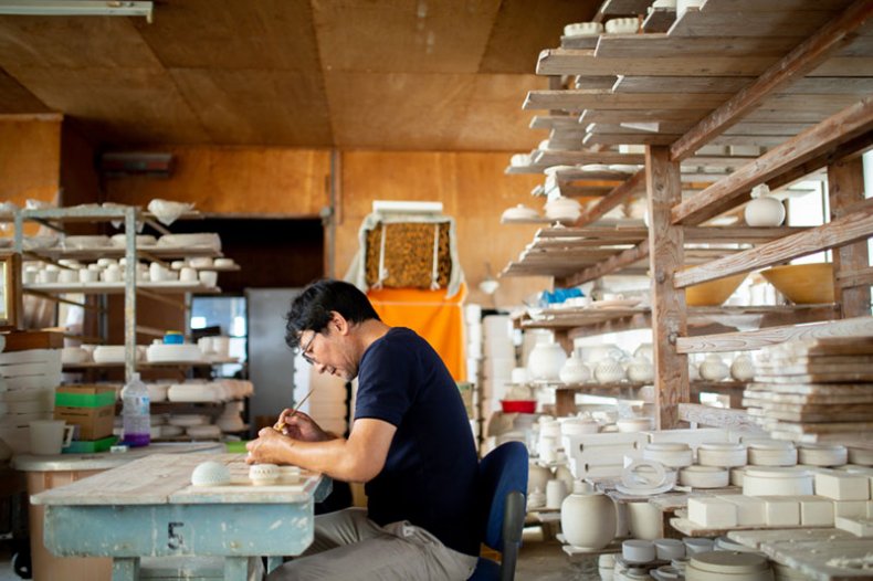 The openwork technique, where motifs are carved out of the porcelain surface with a sharp knife, is not really suited to the character of porcelain clay. The technique has been used in Mikawachi, however, since the Edo period. Using this technique, the Gyokusen kiln produces traditional forms such as multi-level towers and decorative censers. They also create work made to order, and daily utensils such as incense burners and chopstick rests.